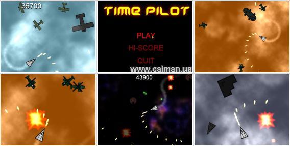 Time Pilot is a remake of a 1980s classic. Take on the role of a pilot travelling through time battling against enemies of increasingly advanced technology. Start in World War I fighting against bi-planes and blimps before progressing though time battling against helicopters, fighter jets, and UFOs! In each time period you visit, you must destroy 100 aircraft before facing the boss. Defeating the boss allows you to progress to the next level. Each aircraft earns you 100 points. Each boss earns you 1000 points.
