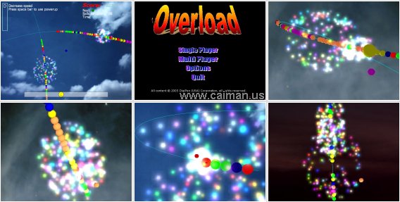 The objective of Overload is to destroy all the balls on the track before a ball reaches the end of the track. To destroy balls, match 3 or more of the same colored balls with the ball that you are shooting.